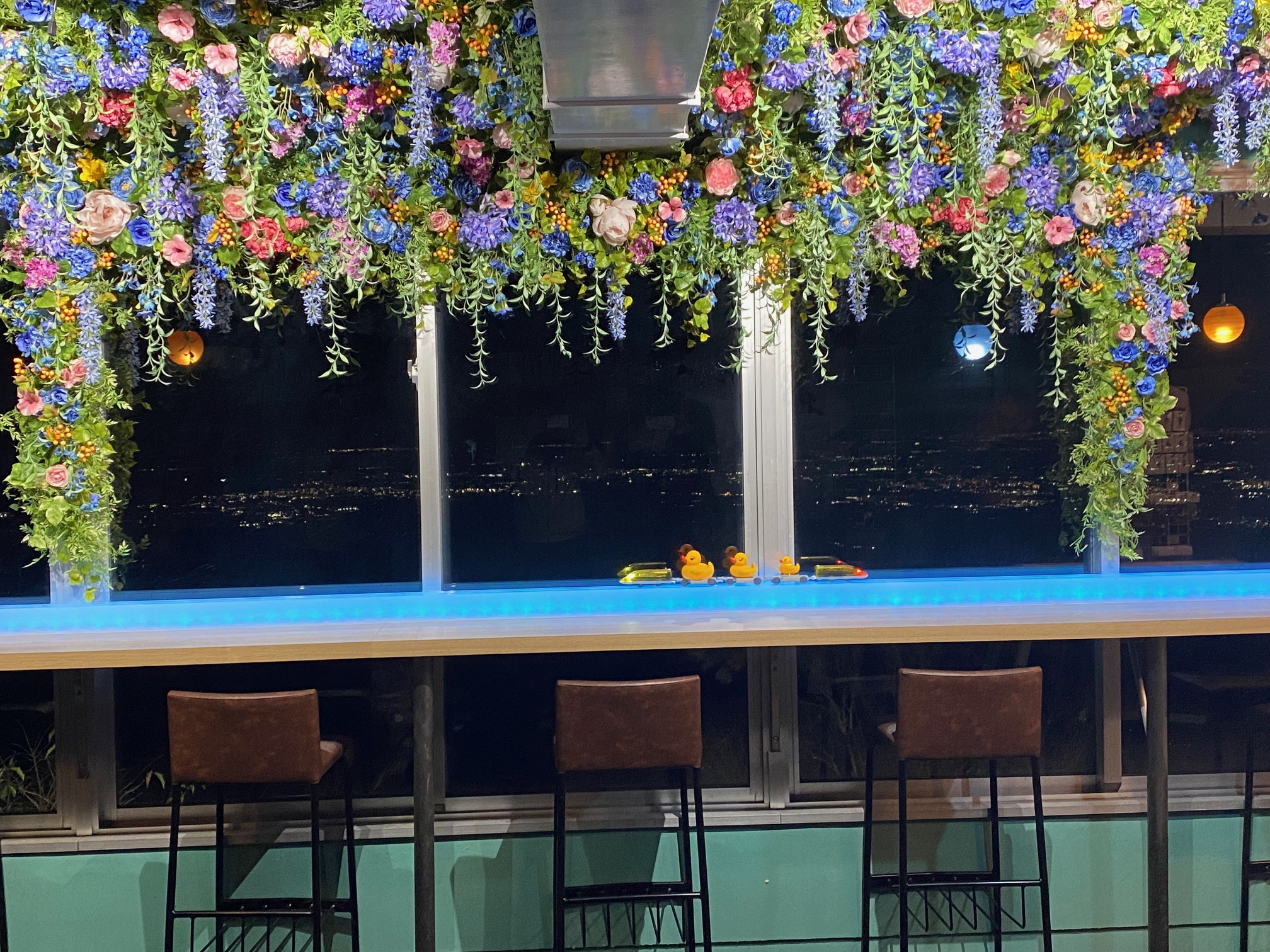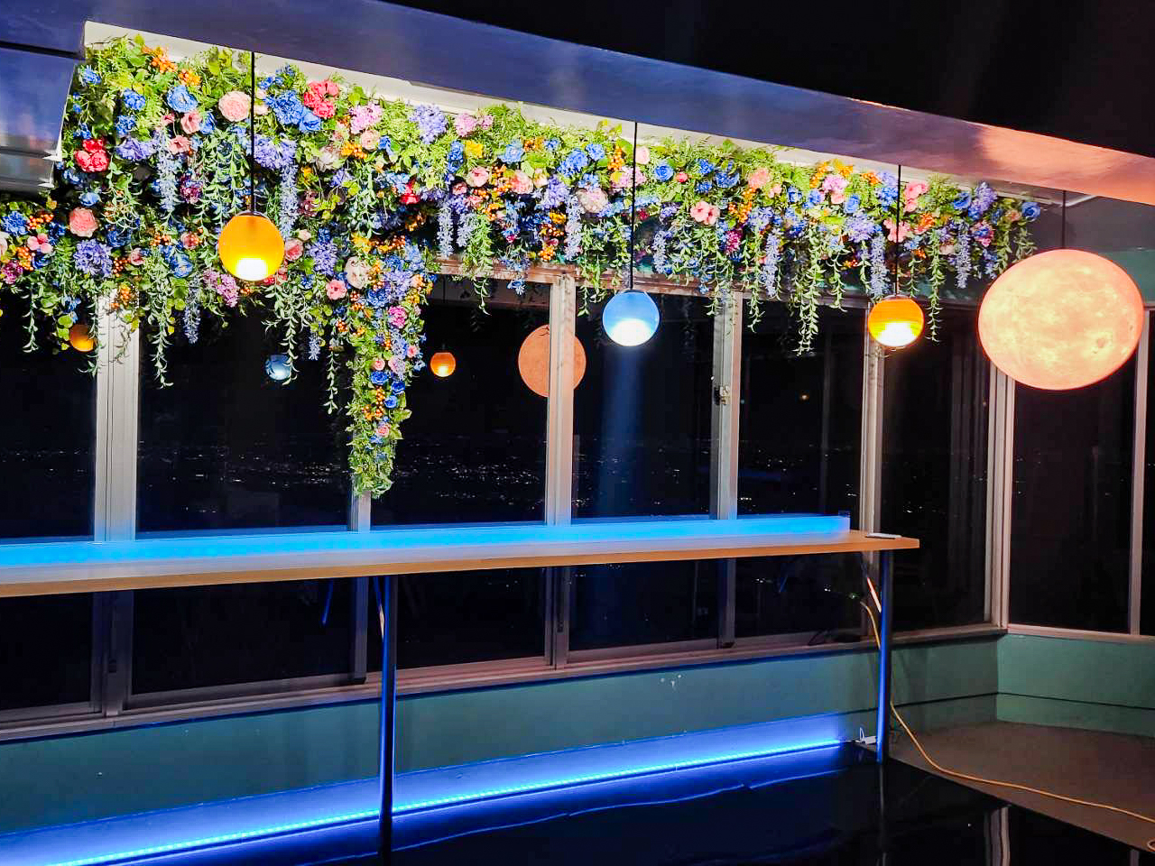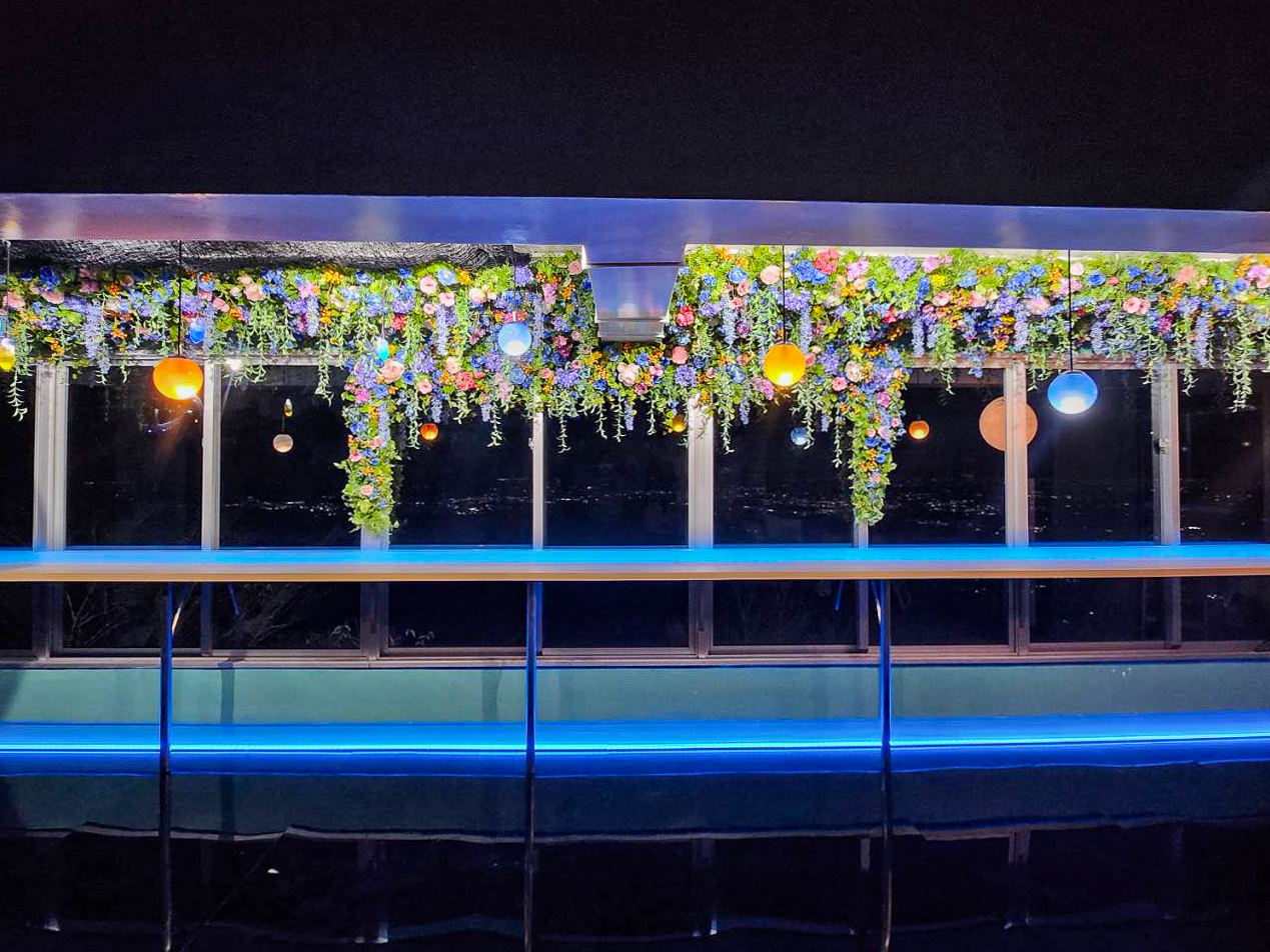 筑波山ロープウェイの山頂にあるカフェレストランにて、カウンター天井のアーティフィシャルフラワー装飾を制作しました。